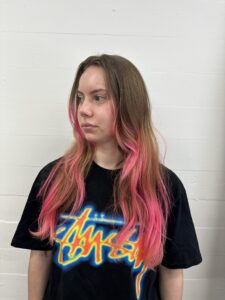 First, let us look at the client’s original hair. Specifically, she arrived with very long, natural dark blonde hair. Also, she had bright neon pink tips at the very bottom. She had bleached those ends completely by herself at home. Consequently, this DIY history made our stylist very cautious. Because, home bleach leaves the hair in a highly unpredictable state. Thus, we did not know exactly how her ends would react to fresh lightener.
